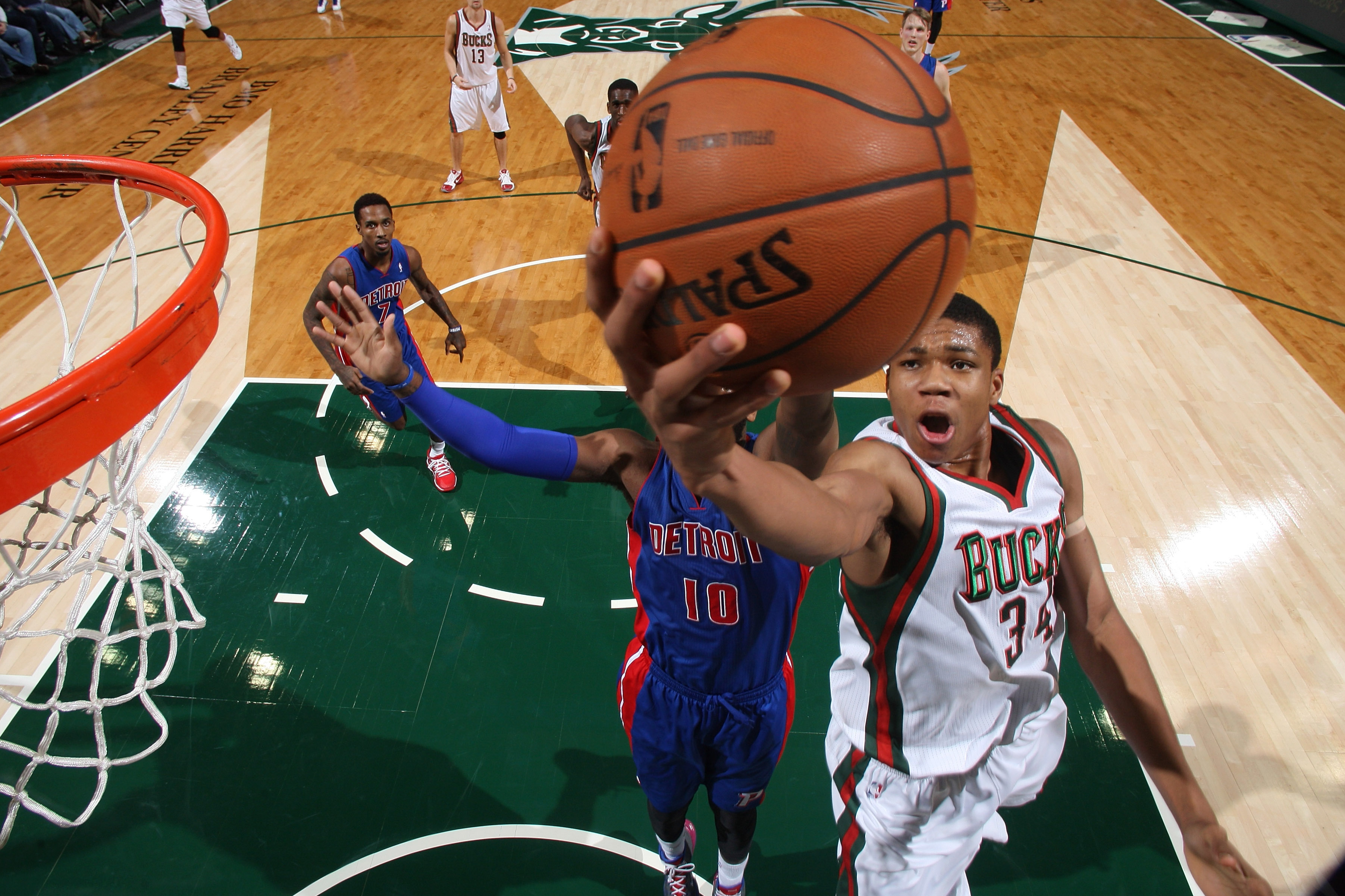 MILWAUKEE, WI – DECEMBER 4: Giannis Antetokounmpo #34 of the Milwaukee Bucks shoots against Greg Monroe #10 of the Detroit Pistons on December 4, 2013 at the BMO Harris Bradley Center in Milwaukee, Wisconsin. NOTE TO USER: User expressly acknowledges and agrees that, by downloading and or using this Photograph, user is consenting to the terms and conditions of the Getty Images License Agreement. Mandatory Copyright Notice: Copyright 2013 NBAE (Photo by Gary Dineen/NBAE via Getty Images)