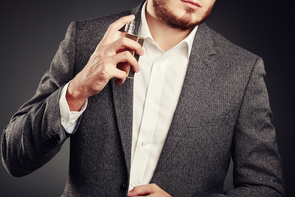 Handsome Young Man using Perfume. Young Man in Business Suit. Casual Style