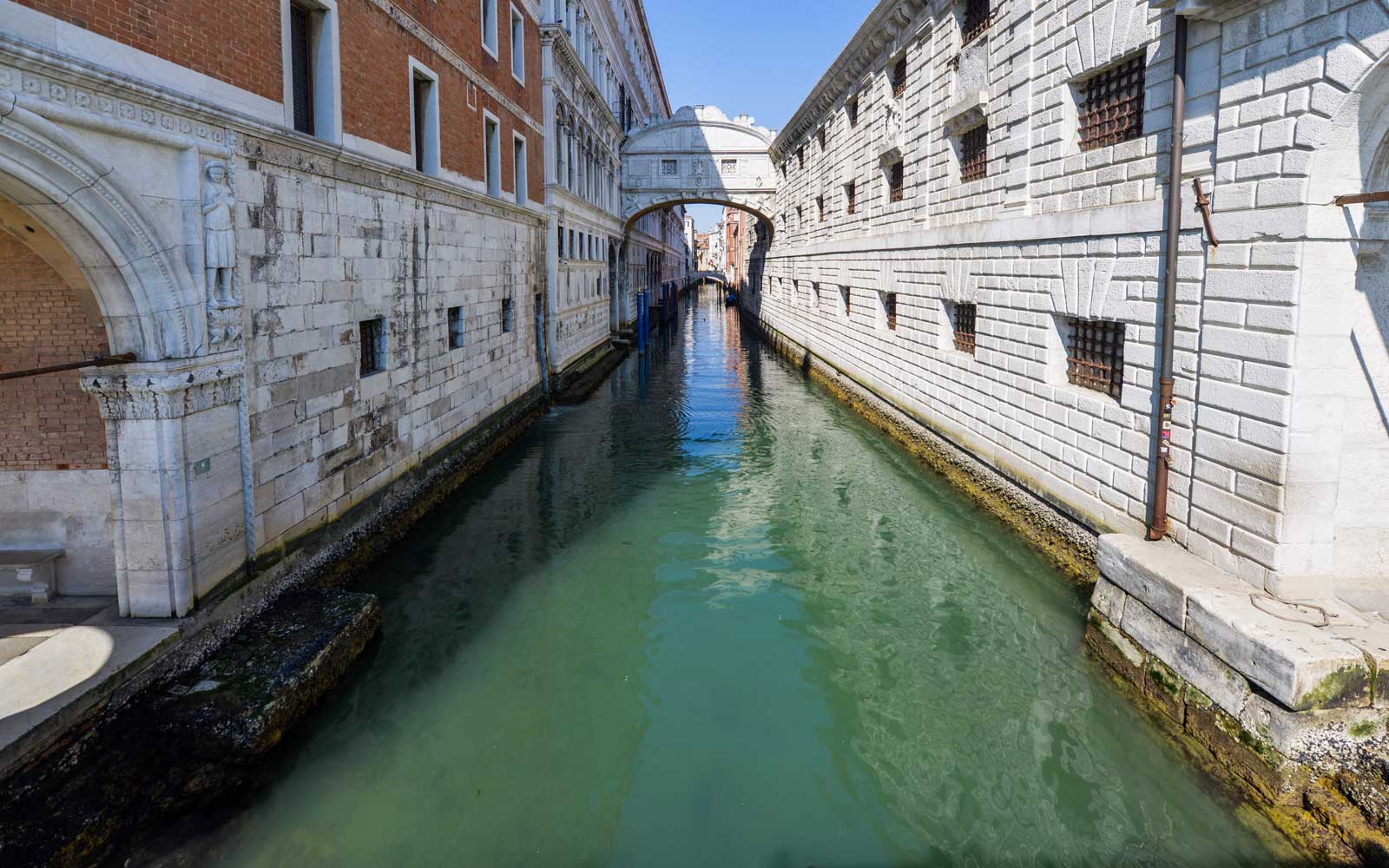 A view shows clear waters below the Bridge of Sighs in a Venice canal on March 18, 2020 as a result of the stoppage of motorboat traffic, following the country’s lockdown within the new coronavirus crisis. (Photo by ANDREA PATTARO / AFP) (Photo by ANDREA PATTARO/AFP via Getty Images)